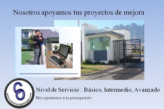 Organizamos y apoyamos mesas directivas de colonias privadas o condominios para el logro de los objetivos y nuevos proyectos de la colonia. Proyectos como instalación de Portones, Plumas, automatización de accesos, coordinamos construcciones dentro de la colonia, apoyo o representación con municipio y gobierno del estado. Contacto: coloniaorganizadamx@gmail.com tel.81-81105647 Cel 8180201528